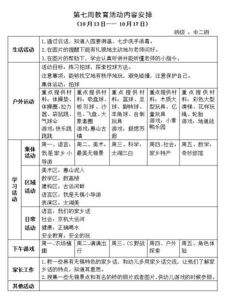 第七周教育活动内容安排
