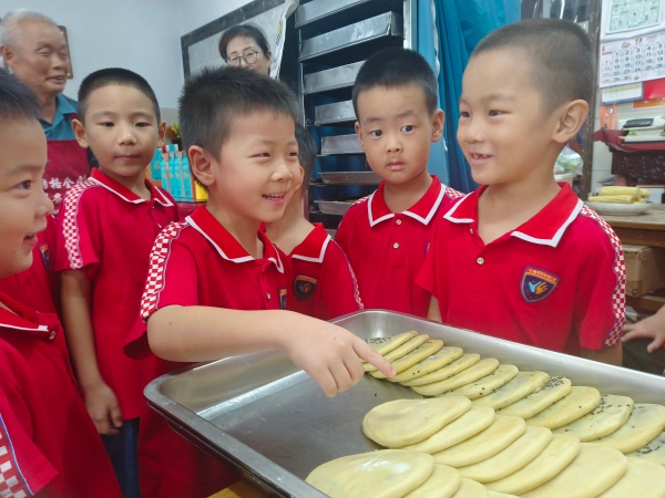 本次主题活动分为体验参观、亲历制作、快乐分享三个部分。参观活动中,中班老师带领幼儿走进石塘湾老街的麦饼店,让幼儿与麦饼店阿姨亲切互动,近距离观察面粉等制作原材料,认真聆听店主讲解麦饼制作步骤,感受麦饼从“擀、撮、拌、团、撒、压”制成麦饼胚,到包裹芝麻、菜猪油等馅料,再放入电饼铛烘烤的全过程。刚出锅的麦饼香气扑鼻,也让孩子们对麦饼制作充满期待。巧手做麦饼活动中,在家长助教肖蕴怡妈妈的带领下,孩子们学习擀平饼皮、包裹馅料、沾水捏紧、按压成型,一个个形态可爱的麦饼胚在孩子们的手中诞生啦!当热腾腾的麦饼出炉,快乐分享活动也拉开了序幕,孩子们兴高采烈地捧着自己的劳动成果,分享给其他老师和小伙伴们,大家品尝着香甜的麦饼,脸上都洋溢着幸福的笑容。